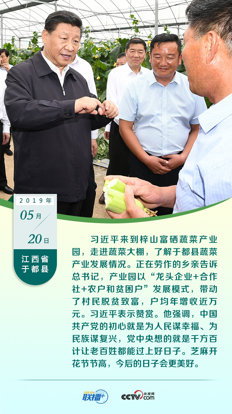 回望过往,习近平在多次地方考察时,都十分重视当地农产品的产业发展。河南的油茶、江西的蔬菜、江苏的草莓……他总是亲自到种植区实地考察,了解当地产业脱贫措施和成绩,关心当地群众的收入和生活状况。