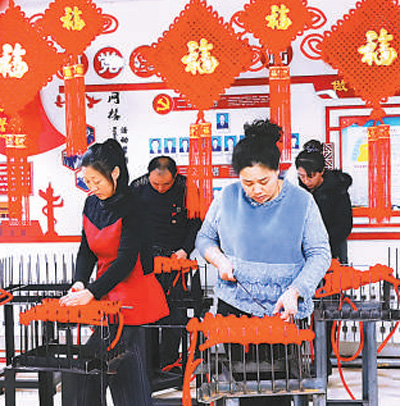 内蒙古自治区扎兰屯市向阳街道向阳村贫困群众编织中国结。