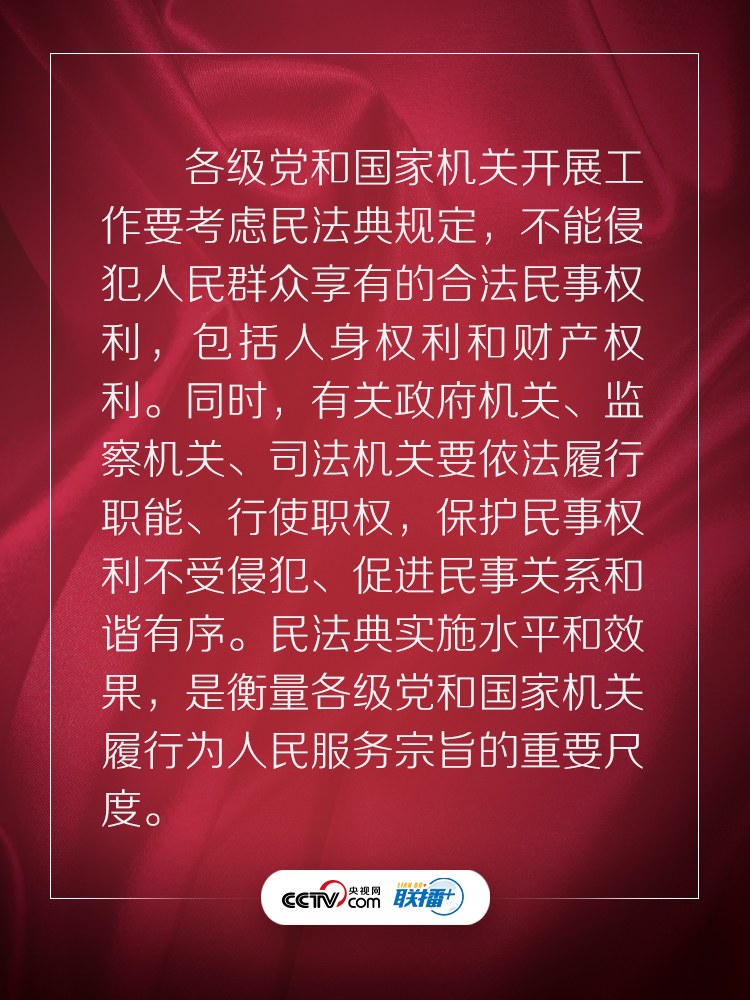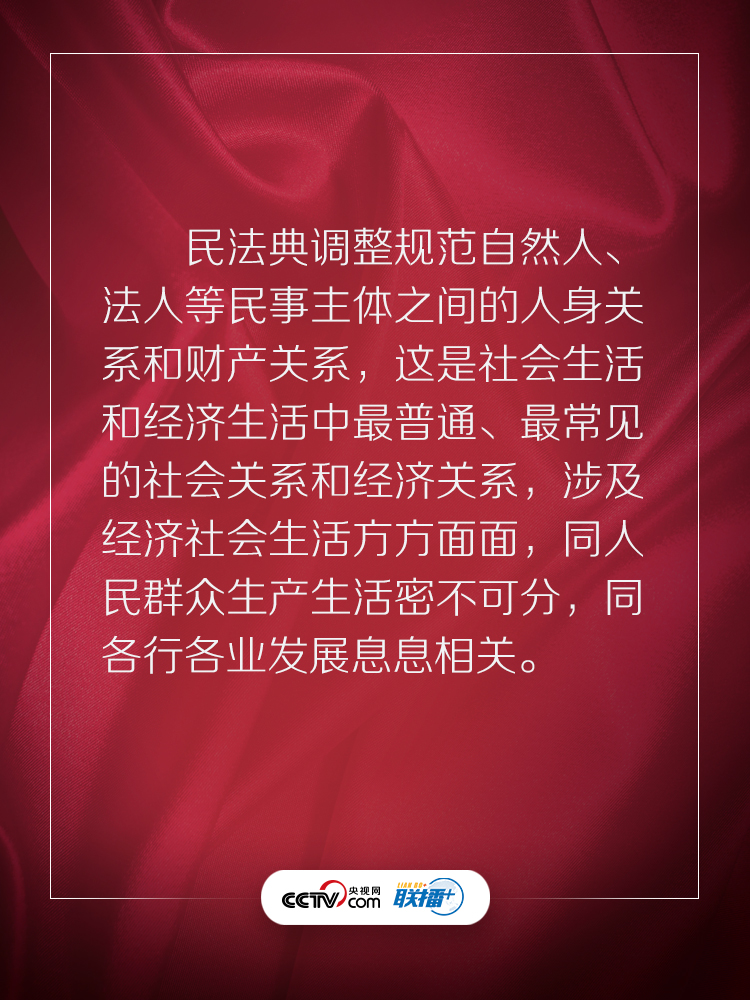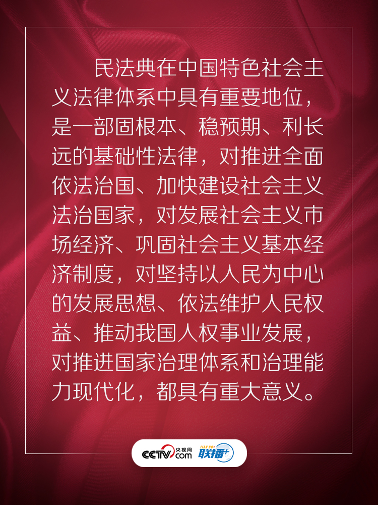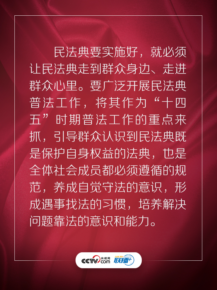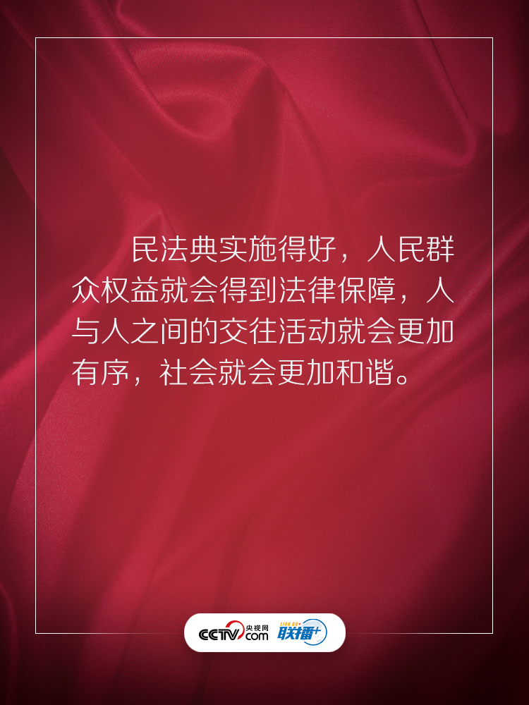民法典回应了人民的期待,充满了以人民为中心的底色。央视网《联播+》特梳理习近平总书记相关话语,与您一起学习感悟。