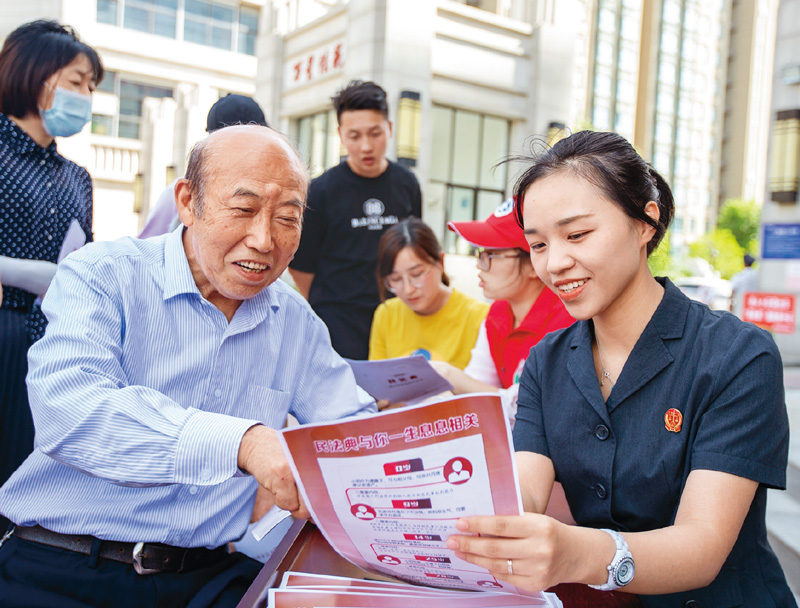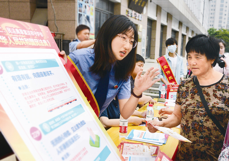 2020年6月6日,江苏省海安市立发街道嘉麟社区联合海安市人民法院开展“民法典让生活更美好”送法进社区活动,法院工作人员和社区普法志愿者把民法典内容简明易懂地告知居民,提高公民的法律素养,用民法典护航美好生活。中新社发 翟慧勇/摄