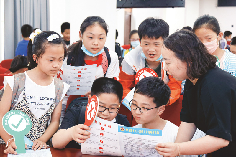 日前,安徽省合肥市瑶海实验小学联合三里街街道人大工委、三里街街道司法所和临淮路社区一起开展“民法典知识进校园”活动。图为瑶海区人大代表用通俗易懂的语言向大家科普民法典知识。安徽省司法厅供图 裴文豪/摄