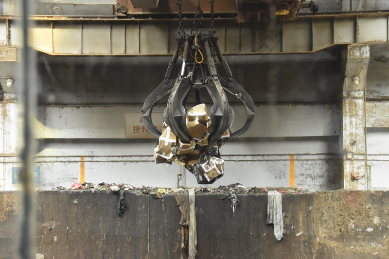 6月3日,海南省公安厅、省禁毒办联合在澄迈县老城经济开发区海口焚烧发电厂举行2020年集中销毁毒品仪式,集中销毁海南公安机关缴获并已结案的1.725吨毒品。图为发电厂工作人员操控机械将公安机关投入转运口的毒品送入销毁设备。新华社记者 刘邓/摄