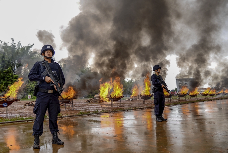 2019年国际禁毒日,云南省德宏傣族景颇族自治州在当地举行公开销毁毒品及禁毒宣传活动,现场销毁缴获的海洛因、冰毒、鸦片、吗啡、咖啡因等各类毒品6.92吨。新华社发 龚建新/摄