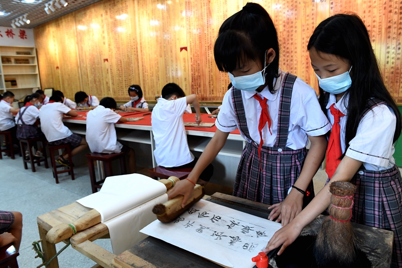 在2020年“6·26”国际禁毒日来临之际,福建省连城县城乡小学学生将提线木偶、雕版印刷及传统花灯等当地客家非遗文化元素,融入校园禁毒宣传活动中,提高防毒、拒毒和禁毒意识。新华社记者 彭张青/摄