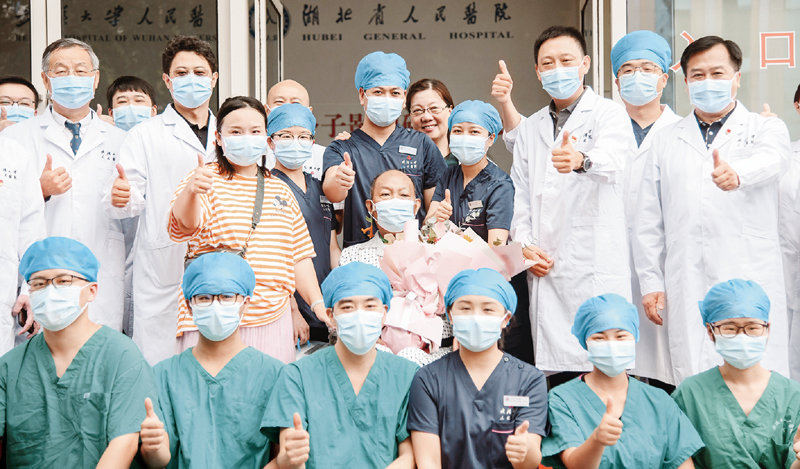 2020年7月21日,湖北首例新冠肺炎终末期肺移植患者崔先生从武汉大学人民医院出院。据悉,今年65岁的崔先生是目前全球已开展的10例因新冠肺炎接受肺移植手术后,首位达到出院标准的患者。图为武汉大学人民医院医务人员与崔先生及其家人等一起合影。新华社记者 程敏/摄
