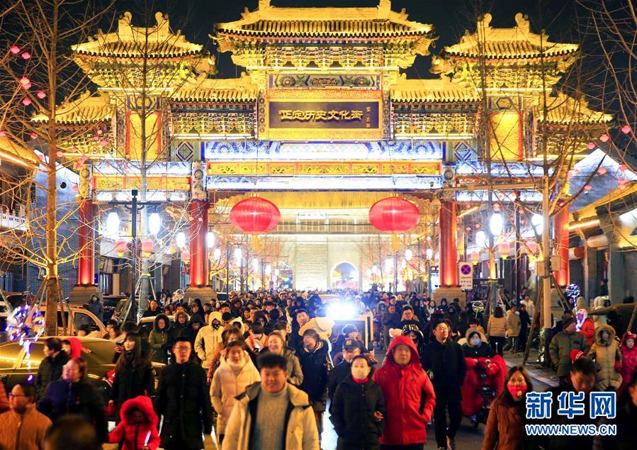 游客在石家庄市正定古城夜游。 新华社发(张海强 摄)