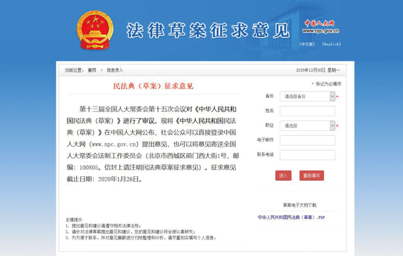 民法典编纂过程中,先后10次通过中国人大网公开征求意见,累计收到42.5万人提出的102万条意见建议。图为民法典(草案)征求意见网页截图。