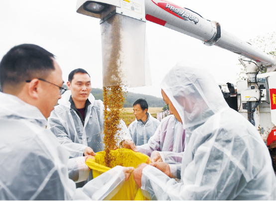 2020年11月2日,湖南衡南双季晚稻试验示范基地传来消息:由袁隆平院士团队培育的第三代杂交水稻“叁优一号”测产结果公布,双季亩产突破1500公斤。图为当日工作人员将稻谷装袋。 新华社记者 陈泽国/摄