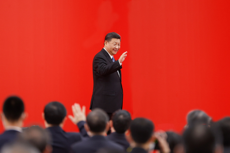 2020年11月12日,浦东开发开放30周年庆祝大会在上海市举行。中共中央总书记、国家主席、中央军委主席习近平在会上发表重要讲话。这是习近平向大家挥手致意。新华社发(盛佳鹏 摄)