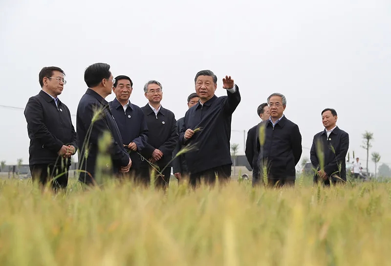 2021年5月14日上午,中共中央总书记、国家主席、中央军委主席习近平在河南省南阳市主持召开推进南水北调后续工程高质量发展座谈会并发表重要讲话。这是座谈会前,习近平于13日在考察途中临时下车,走进一处麦田察看小麦长势。新华社记者 王晔/摄