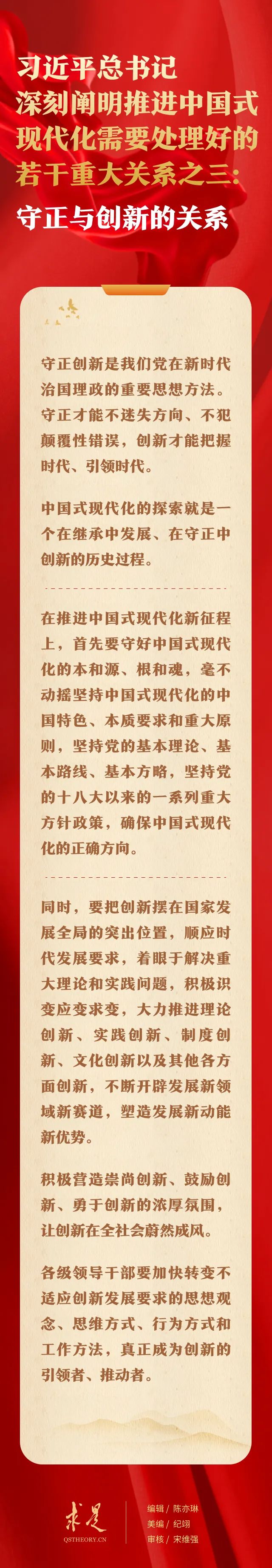 10月1日出版的第19期《求是》杂志刊发习近平总书记重要文章《推进中国式现代化需要处理好若干重大关系》。在这篇重要文章中,总书记从“顶层设计与实践探索的关系”、“战略与策略的关系”、“守正与创新的关系”、“效率与公平的关系”、“活力与秩序的关系”、“自立自强与对外开放的关系”6个方面,深刻阐明推进中国式现代化需要处理好的一系列重大关系,提出明确要求。
