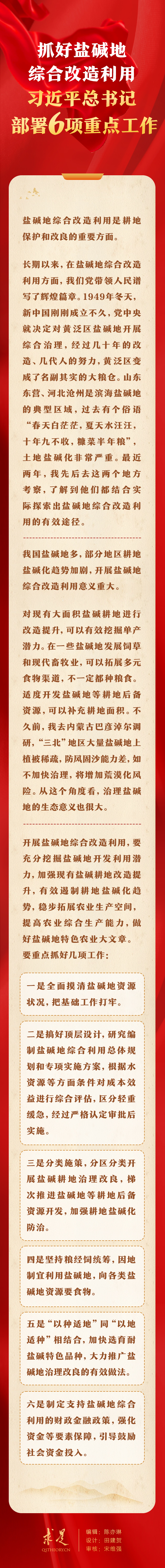 12月1日出版的第23期《求是》杂志刊发习近平总书记重要文章《切实加强耕地保护 抓好盐碱地综合改造利用》。在这篇重要文章中,习近平总书记深刻指出“盐碱地综合改造利用是耕地保护和改良的重要方面”,“开展盐碱地综合改造利用意义重大”,并从6个方面对抓好盐碱地综合改造利用作出系统部署,指明了工作重点。