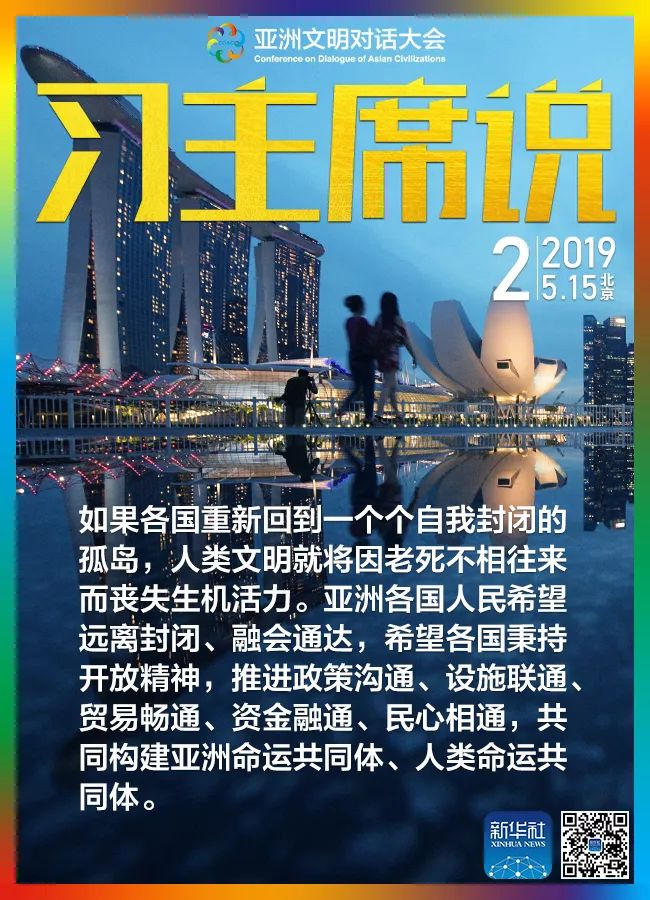 2. 如果各国重新回到一个个自我封闭的孤岛,人类文明就将因老死不相往来而丧失生机活力。亚洲各国人民希望远离封闭、融会通达,希望各国秉持开放精神,推进政策沟通、设施联通、贸易畅通、资金融通、民心相通,共同构建亚洲命运共同体、人类命运共同体。