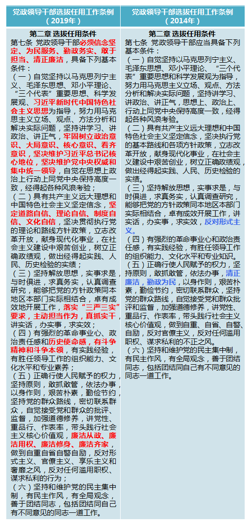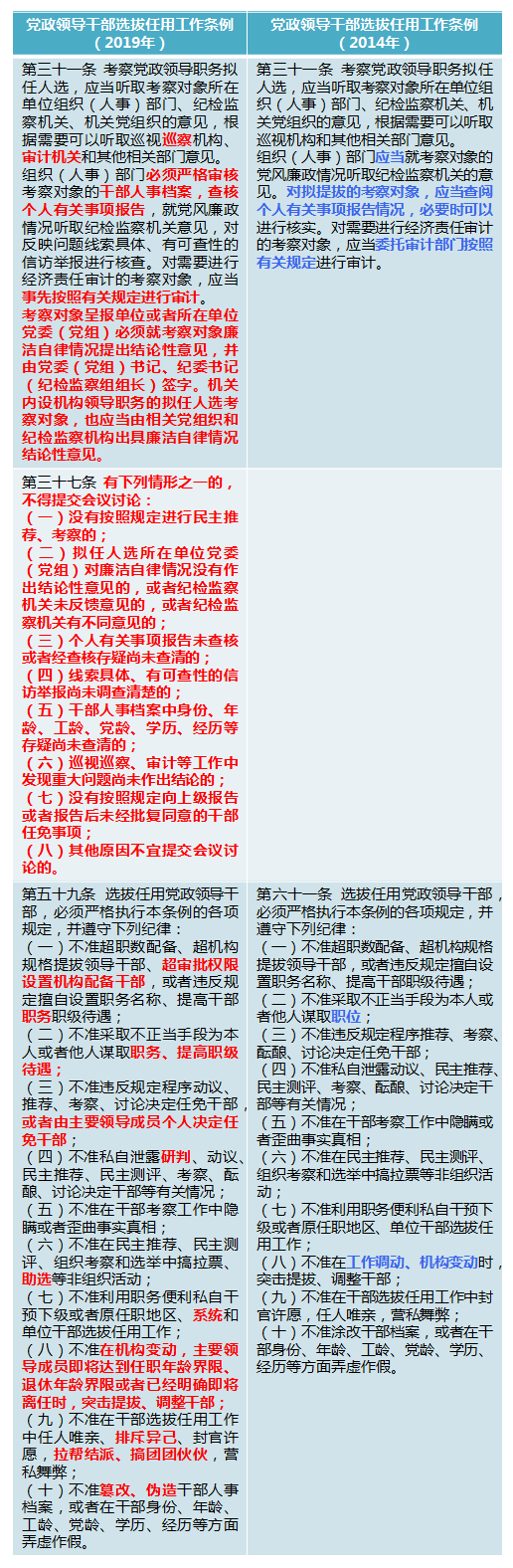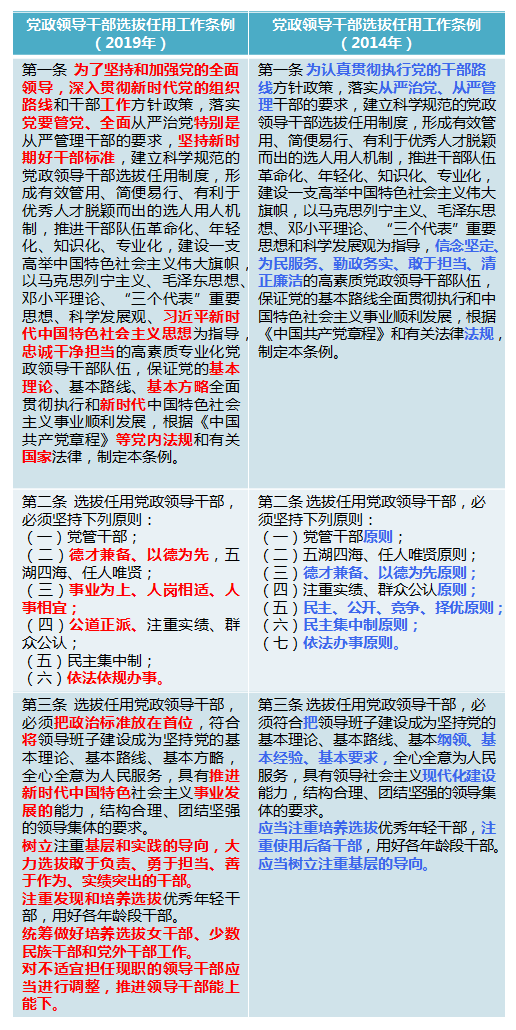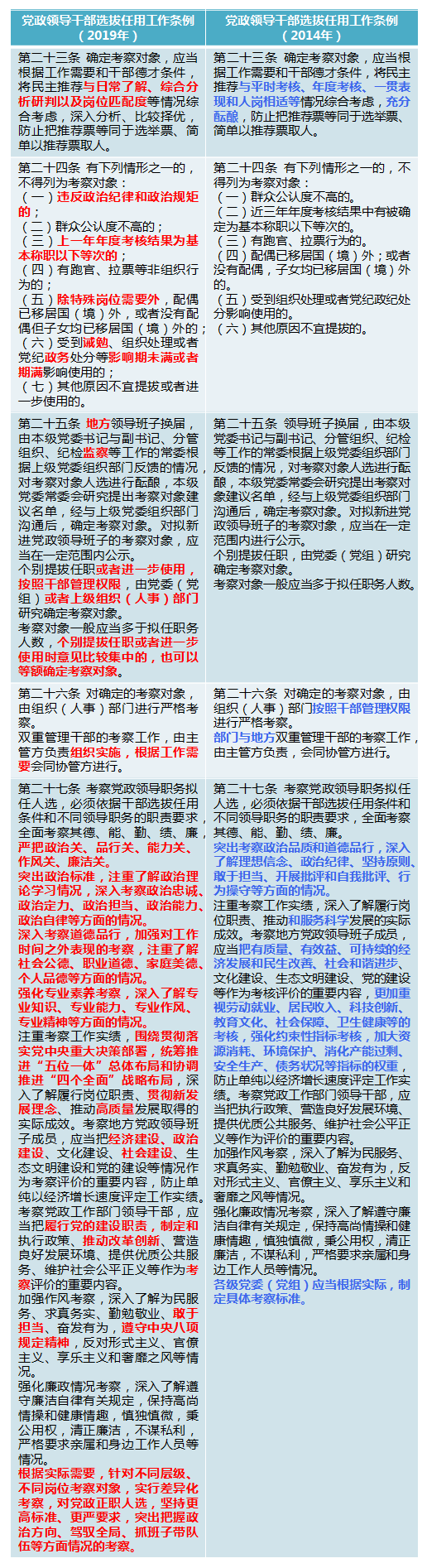 《干部任用条例》是重要的党内法规,是干部选拔任用工作的基本遵循。自1995年《党政领导干部选拔任用工作暂行条例》颁布以来,党中央先后于2002年、2014年两次作出修订。《干部任用条例》时隔五年再次修订适应新形势新任务需要,对不少内容进行了修改、调整。人民网·中国共产党新闻网梳理比对新旧选任条例,带您一览其中变化。