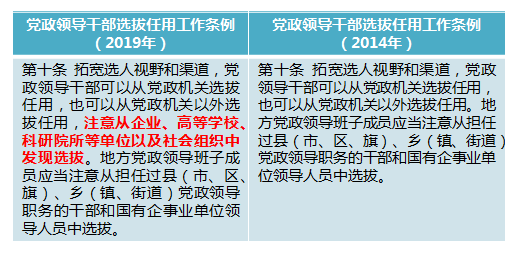 此外,坚持五湖四海、任人唯贤,是中国共产党历来坚持的选人用人理念。第二章第十条在“拓宽选人视野和渠道”方面条例鲜明提出“注意从企业、高等学校、科研院所等单位以及社会组织中发现选拔”党政领导干部,充分体现了党择天下英才而用之的胸怀,努力把方方面面的优秀人才集聚到党和人民的事业中来。