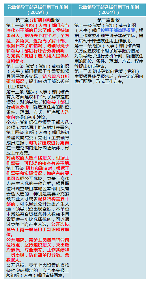 此外,此次修订对动议部分中“公开选拔、竞争上岗”的内容进行了重新定位,由原来“党政领导干部选拔任用的方式之一”调整为“产生人选的一种方式”,不再单列为一章,将相关内容调整到动议环节,并对改进完善工作程序等提出原则性要求。这样修订,与其功能定位和工作实践更相符。