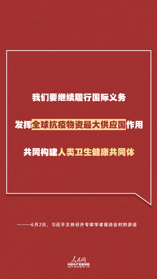 习近平强调,这次疫情发生以来,我们秉持人类命运共同体理念,积极履行国际义务,密切同世界卫生组织和相关国家的友好合作,主动同国际社会分享疫情和病毒信息、抗疫经验做法,向100多个国家和国际组织提供力所能及的物质和技术援助,体现了负责任大国的担当。我们要继续履行国际义务,发挥全球抗疫物资最大供应国作用,共同构建人类卫生健康共同体。