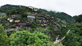 进入重庆梁平区竹山镇猎神村时,天空正巧下起了一阵如丝的小雨。雨雾中,成片翠竹落满晶莹的水珠,游客撑着雨伞,沿草木掩映的曲径漫步,伴着山间虫鸣声,一派悠然景致。
