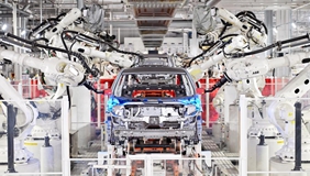 走进工厂,一幅充满未来科技感的汽车制造场景映入眼帘——冲压、焊装、涂装、总装、电池电驱车间星罗棋布,工业机器人手臂升降旋转,自动导航运输车往来穿梭,智能控制屏幕上数字闪烁,在自动化机械与专业人工的配合下,每54秒,就有一辆新能源汽车顺利下线。