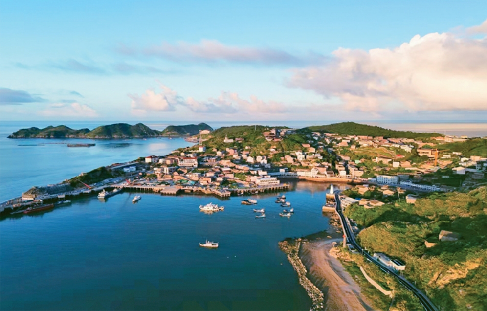 位于宁德市霞浦县的三沙镇东壁村,游人如织。登高远眺,只见青山环抱、碧海连天、渔舟唱晚,诗意盎然。一侧是依山而建的民宿群落,另一侧是唯美的海岸线与落日余晖。