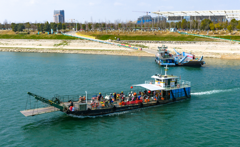 农历腊月十九,春运第五天,早上八点,湖北枝江的余家溪码头,靠岸的客渡船和汽渡船已经挂上了灯笼、拉起了横幅“平安渡运 欢迎回家”。待渡的返乡轿车和运输货车排着长队,从码头入口处一直延伸到主路百米以外。记者从江北的余家溪码头搭乘汽渡船,近九点才抵达彼岸的百里洲。